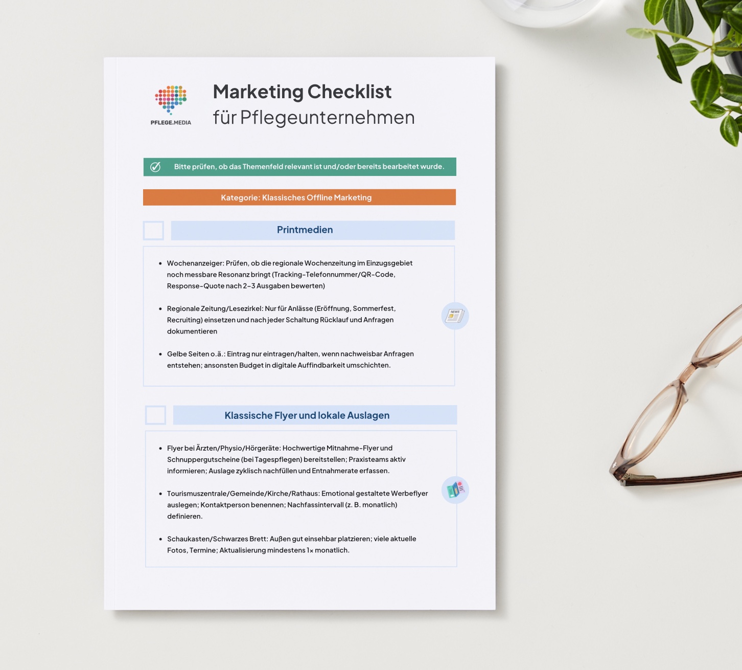 Diese umfassende „Pflege Media Marketing Checkliste“ wurde speziell für Pflegeeinrichtungen entwickelt und hilft Ihnen, sichtbarer zu werden, neue Gäste und Mitarbeitende zu gewinnen und Ihre Marke nachhaltig zu stärken.